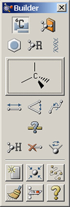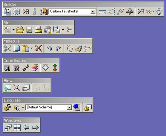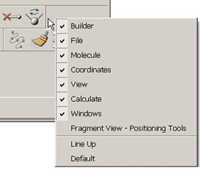 デフォルトでGaussViewのメニューバーの下に現れるツールバーを個別に図2に示します。「Builder」ツールバーは、ViewメニューからBuilderを選択することで、図の右にあるように表示させる事が出来ます。個々のツールバーのハンドルをつかんで領域外にドラッグすることで、メインツールバーから分離させることが出来ます。分離したツールバーを元のツールバーエリアに戻すには、メインツールバーのところまでドラッグするかバーそのものをダブルクリックします。