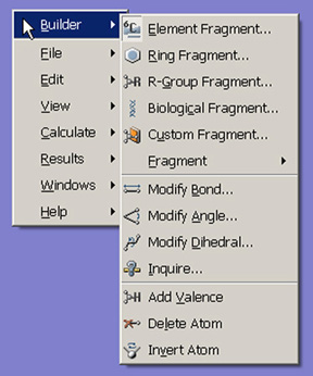 分子ウィンドウ内を右クリックすることで、コンテクストメニューが現れます。コンテクストメニューの内容は、「Builder」、メニューバー、そしてツールバーの大部分と同じものです。これは、ユーザーの利便性を上げるものとして提供されています。