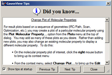 メニューからHelp=>GaussView Tipsと選択すると、プログラムを有効に使うための様々なヒントを表示したGaussView Tipsウィンドウが開きます。ウィンドウの最下部にあるチェックボックスを用いて、GaussViewが起動するたびにヒントを表示させるようにすることが出来ます(デフォルトではチェックされています)。