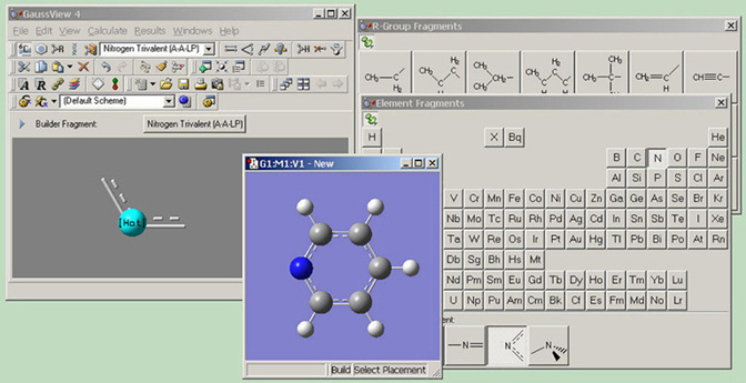 GaussViewの特徴のいくつかがここで見えます:左上から時計回りに見て行くと、まず操作の中心となるGaussViewコントロールウィンドウが表示されています。ここには、メニューバーと様々なツールバー・カレントフラグメントビューが含まれます。次に、分子に追加する官能基や個々の原子を選択するのに用いるパレットが表示されています。ユーザー設定により、他のパレットを開いたときでもパレットを出したままにしたり、あるいは他のパレットを開いたらすぐに閉じるようにすることができます。最後に、作成中の分子を表示しているアクティブビューウィンドウが表示されています。