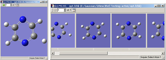 シングル/マルチビューアイコンをクリックすることで、複数の分子を同時に見ることが出来るマルチビューモードに切り替わります。分子は、フィルムの一片にあるフレームのように隣り合って並べられます。分子の番号は個々の分子フレームのすぐ下に白字で表示されます。現在アクティブな分子は他の分子と区別するため少し明るい背景で表示され、原子の選択やダイアログと関わります。アクティブな分子ウィンドウでない、別の分子ウィンドウをクリックすると、それがアクティブな分子になります。個別の分子全てがビューウィンドウ内に納まらない場合は、ビューウィンドウの下部にスクロールバーが表示され、異なる分子に表示を移動することが出来ます。