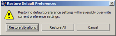 環境設定で「Default」ボタンをクリックすると、このダイアログが表示され、全ての環境設定をデフォルトに復元するかもしくは現在表示されているダイアログに関してのみを戻すかの、いずれかを選択することが出来ます。