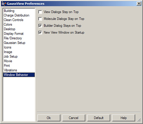 「Window Behavior」環境設定は、様々なGaussViewウィンドウがどのように振舞うかをコントロールします(図8)。
