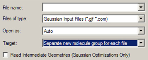 オペレーティングシステムの通常の「Open File」ダイアログに、GaussViewが3つの項目と3つのチェックボックスを追加しています。