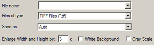 「Files of type」は、ファイルリストに表示するファイルのフィルターとして使用します。「Save as」は、作成する画像ファイルの種類を指定します。デフォルトでは、ファイルの拡張子で決定されます。使用できる画像タイプは、TIFF, JPEG, Vector Image, BMP, PNG, JPEG-2000, GIFです。通常は、高解像度印刷にはTIFF形式を、ウェブやプレゼンテーション用にはJPEGかPNGをお勧めします。