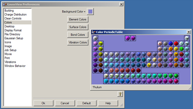 - Element Colors:元素単位での色分け。このボタンをクリックすると、周期律表が表示され、各元素のデフォルトの色が示されます(図51)。元素をクリックすると、デフォルトの色設定を変更できます。