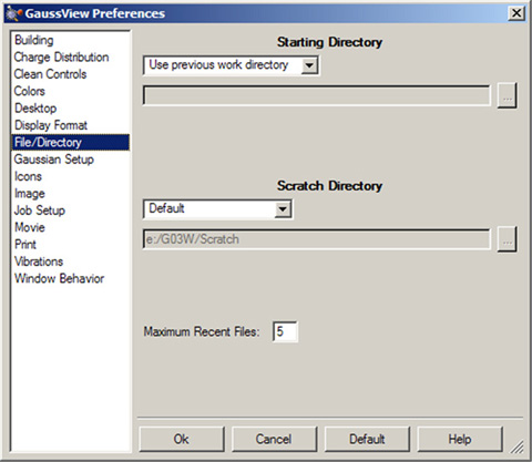 このダイアログでは、ファイルを開いたり保存したりするデフォルトのフォルダーの位置やGaussViewのスクラッチディレクトリーを指定します。また、「Recent File」リストに登録するファイルの数なども指定できます。