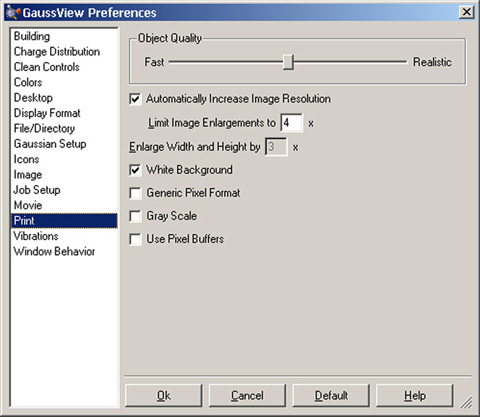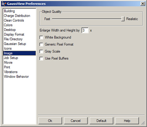 このパネル上部のオプションは、ビューウィンドウ内の分子がマウス操作で動いている時とそうでない時の、表示品質を規定します。動作スピードの遅いコンピューターでは、動かしていない時の「Stationary Object Display」の設定はスライダーを「Realistic」側にしておいて、動かしている時の「Moving Object Display」のスライダー設定を「Fast」側にすれば操作しやすいと思います。