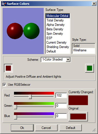 図52に示したダイアログで、単一色の表面を設定します。正と負のローブを持つ表面は、それぞれの色を設定します。図は、分子軌道表面の設定を行っています。他の色を設定するダイアログも、これと同様の構成になります。