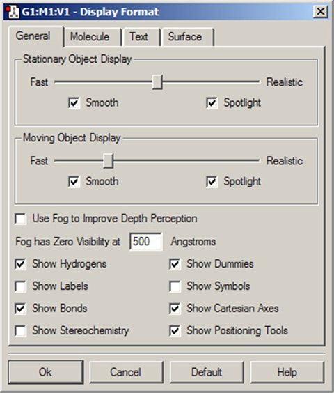「Display Format」ボタンか「 View=>Display Format」メニュー項目を使用すると、「Display Format」ダイアログを開くことができます。このダイアログの各パネルは、「Preferences」の「Display」にも含まれています。ここでは、「General」「Text」「Molecule」各パネルの説明をします。「Surface」パネルに関してはここ以降で説明します。