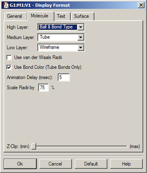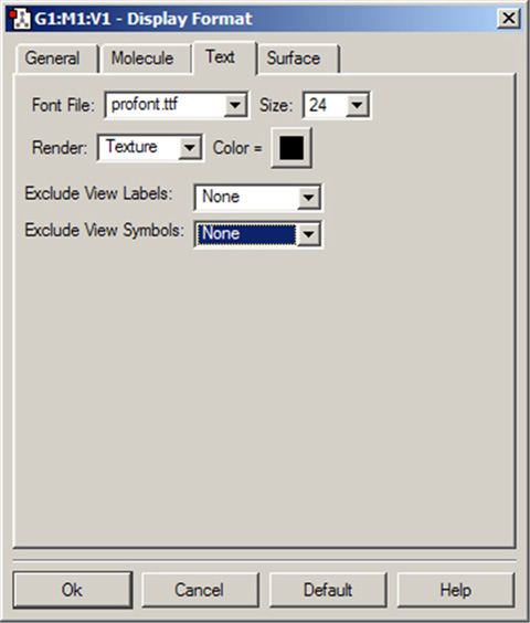 Display Format」ダイアログの「Text」パネルでは、フォントと原子ラベルと記号を設定できます。上で説明したように、ラベル表示を除外する原子の設定もできます(図50)。