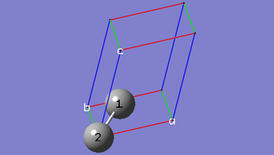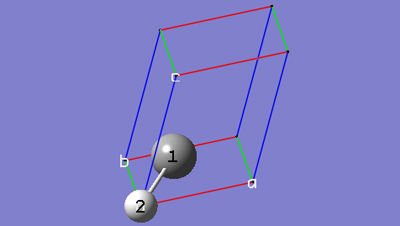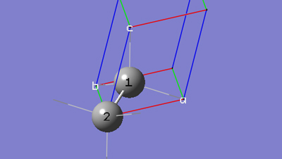 3-13 PBCダイアログの「Cell」タブで、「Vertex:」を「b (0,1,0)」から「c (0,0,1)」に変更してください。これにより、マウスを使用してセルの「c」格子ベクトルの先端を分子ビューウィンドウで指定できます。分子ビューウィンドウで、2番の原子をクリックしてください。