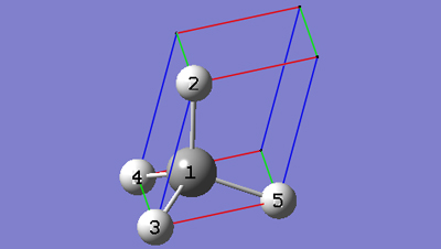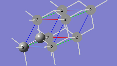 3-7 ダイヤモンドのCC結合距離の実験値に合うように、CH結合距離を修正します。ツールバーの「Modify Bond」ボタンをクリックし、ビューウィンドウの1番と2番原子をクリックします。「Semichem Smartslide」ダイアログが表示されますので、結合距離を1.07から1.54に修正し「OK」ボタンを押します。全てのCH結合距離は、 Td対称性を保たせるために、1.54へ自動的に修正されます。「Point Group」ダイアログで「Enable Point Group Symmetry」ボックスのチェックを外してから「OK」ボタンを押してください。