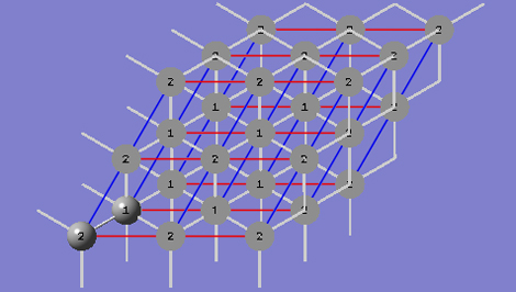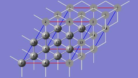 3-21 「PBC」ダイアログの「View」タブで、「Cell Replication」の「Combine」ボタンをクリックします。これにより、基本セルと複製されたセルが統合され、基本単位胞より8倍大きな「スーパーセル」となります。原子の番号が変わっています。また、表示されているセルの数が、混乱を避けるため自動的に1に減らされています。