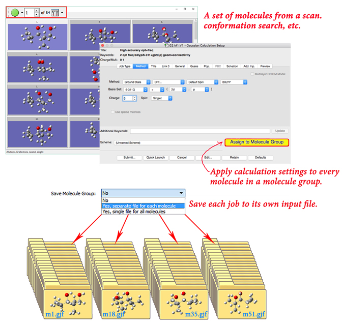 以下の例は、配座探索により得られた84の分子構造に対する設定です。 Opt+Freq計算を設定し、それをグループ内の全ての分子について適用しています。分子グループ全体を保存する場合は、各分子についてジョブファイルを個別に保存されます。