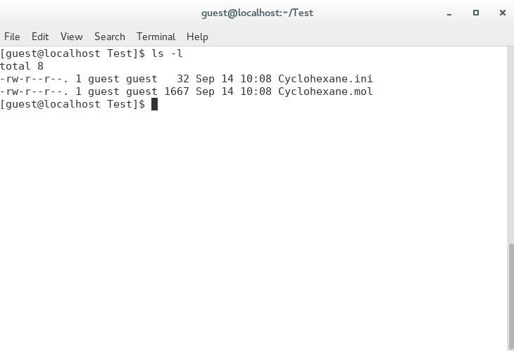 下記コマンドを実行し、Homeディレクトリに「Test」フォルダを作成した後、「Cyclohexane.mol」と「Cyclohexane.ini」をコピーします。